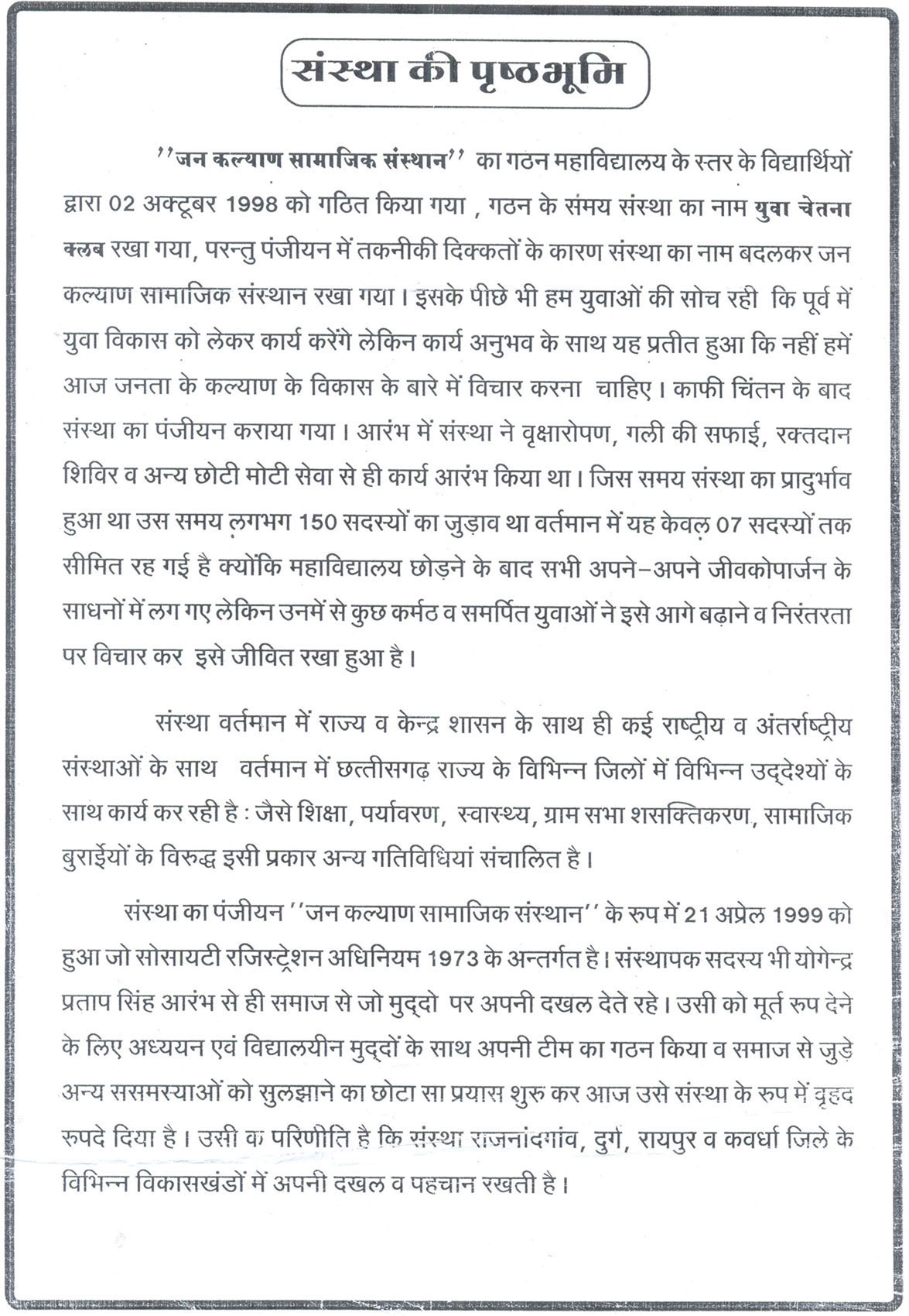 ORGANISATIONAL HISTORY OF JANKALYAN SAMAJIK SANSTHAN